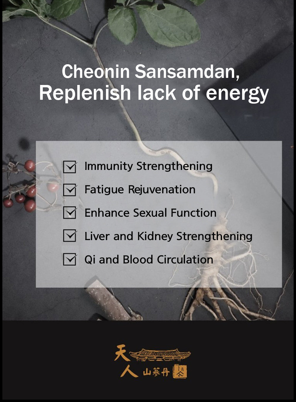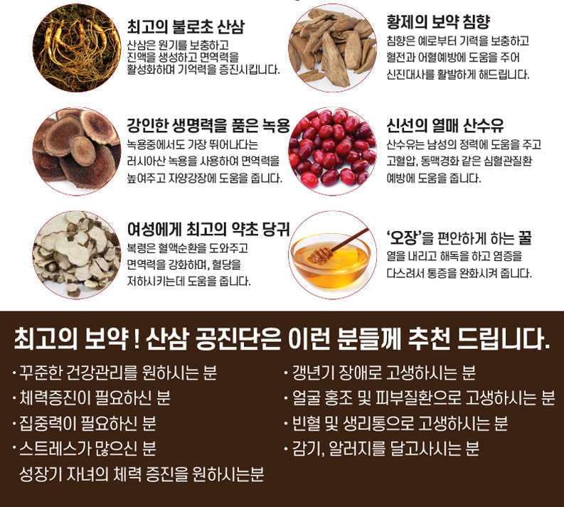 허약체질을 개선하고 면역력을 올려줍니다. 만성피로 회복등에 효과가 있으며 스트레스를 감소시키며 염증치료에 탁월한 약성이 포함된 약재와 심장을 튼튼하게 하여 몸을 따뜻하게 하는 약재들로 기혈을 순환시켜줍니다.