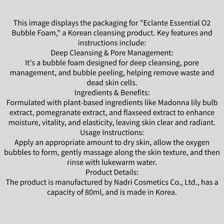 Refresh your skin with the purifying power of oxygen bubbles. Essential BUBBLE FOAM O₂ is a self-foaming cleanser that deeply cleanses pores, removes impurities, and revitalizes the skin with micro-oxygen bubbles and botanical extracts. The rich, airy foam gently lifts away dirt, excess oil, and makeup while maintaining your skin's natural moisture balance.