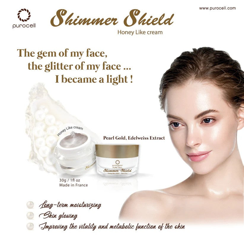 Made in FranceThis jelly-like cream, Shimmer Shield, is a formula consisting of a combination of pearl powder and natural Edelweiss extract from the Swiss Alp Mountains. It coats the skin, giving a long-term moisturizing effect, leaving skin glowing. In addition, when applied, the cream turns to a honey-like texture, improving the vitality and metabolic function of the skin.